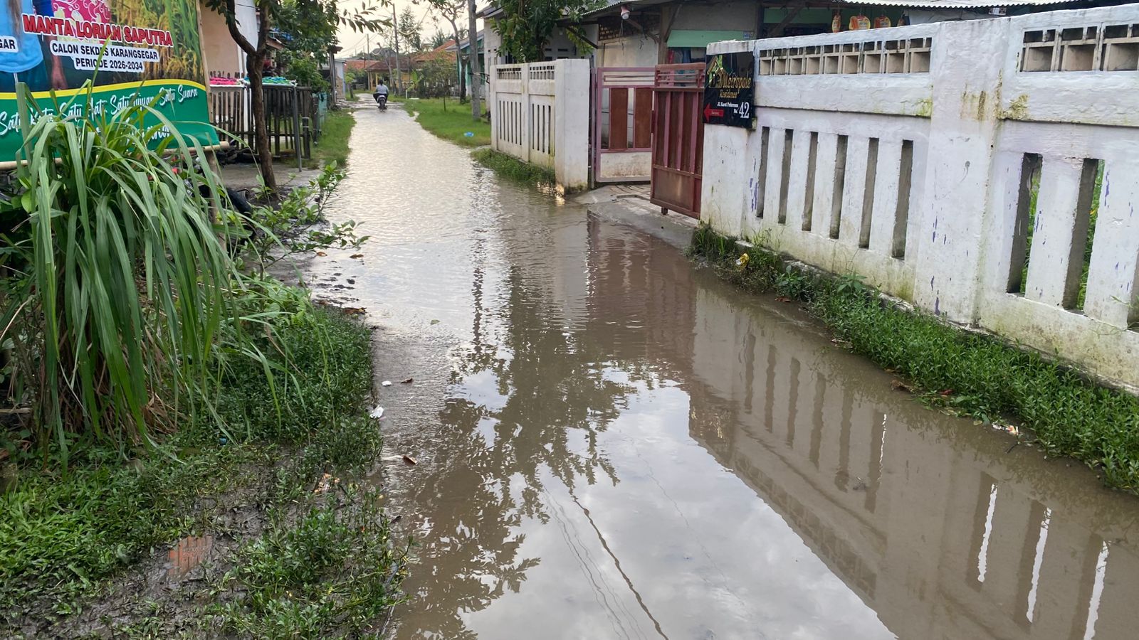 LENTERAINFO.ONLINE|Kabupaten Bekasi — Setiap kali hujan deras mengguyur, Gang Poncol di Desa Karang Segar seolah memiliki “ritual” yang sama: air naik, jalan tenggelam, aktivitas lumpuh. Pada Selasa (23/02/2026), genangan air berwarna cokelat keruh kembali menutup sebagian besar badan jalan hingga merambat ke depan pagar rumah warga. Akses lingkungan yang menjadi urat nadi pergerakan masyarakat berubah menjadi kubangan panjang yang licin dan membahayakan.